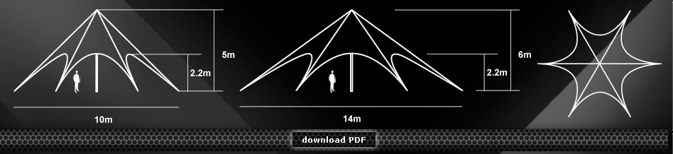 - Aluminium Tube: Dia.63 mm., 2.5 mm. thickness - Fabric: 420 D polyester pvc coating, 320 gsm, waterproof, fire retardant and UV protection. - Height: 5 m., 6 m. - Diameter: 10 m., 12 m., 14 m., 16 m.